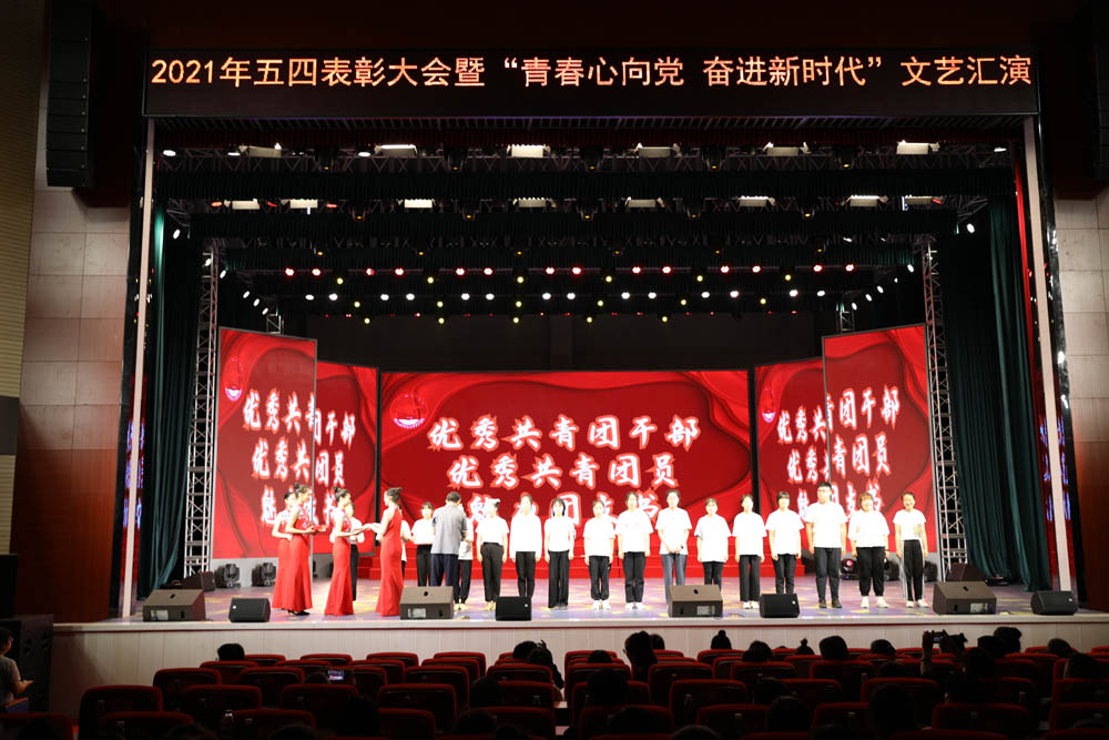随后,文艺汇演在朗诵《穿越时空的对话》中拉开帷幕。由各学院及附属艺术中专选送的节目为大家奉献了一场青春飞扬的视听盛宴。有创新演绎,歌颂革命精神的乐队演唱《红梅赞》、展示青春柔美的舞蹈《茉莉花开》;有讲述五四运动、弘扬五四精神的话剧《破晓》、有讲述军嫂默默奉献,默默等待的感人舞蹈《我等你》;有热力四射、青春无限的街舞表扬《OH MY GOD》、有讴歌共和国发展历程的朗诵《我的祖国》……整场文艺汇演,歌舞飞扬、青春四溢,原创诵读、感人至深,典型表彰、催人奋进。一首首动人的旋律张弛跌宕,一场场动人心弦的表演交相呼应,青年学子用歌舞和表演重温了五四运动102年来的丰功伟绩,用真诚的表演为建党百周年献礼。