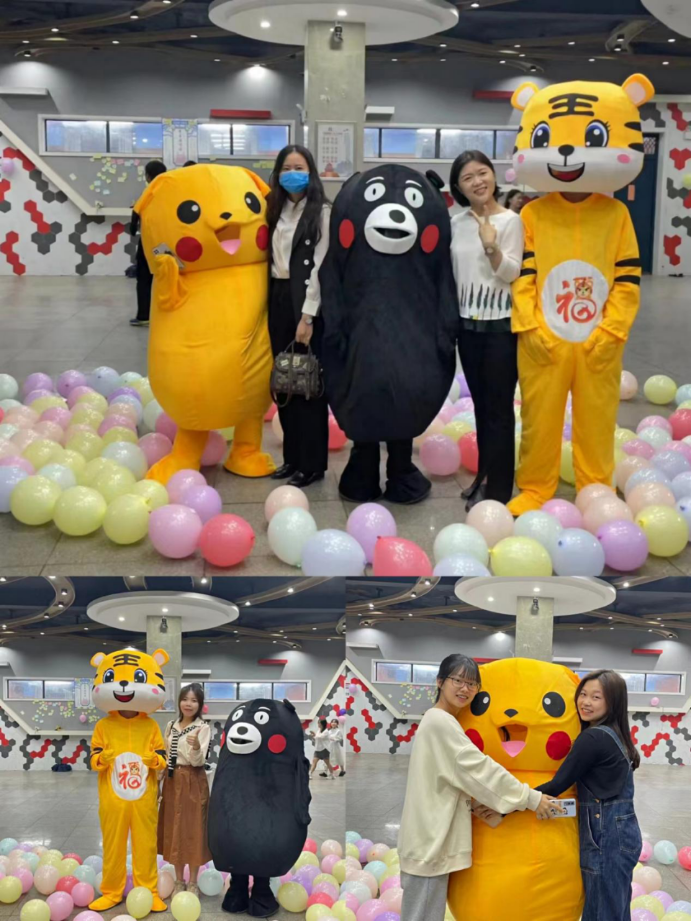 来到我们的游戏区,进门就可以看见我们可爱的皮卡丘和熊本熊在等待着给大家爱的抱抱。老师们也迫不及待地跟玩偶拥抱、合影。