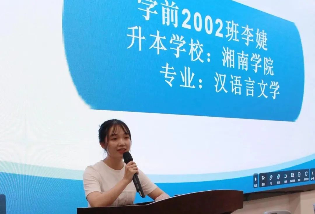 分享会第一个环节:专升本优秀学生经验分享。她们专升本的学校分别是吉首大学、湖南第一师范学院、怀化学院、湘南学院等。她们从招生政策解读、专业学校选择、历年录取情况、报考条件、考试科目、考试方式等方面分享了自己的备考经验。