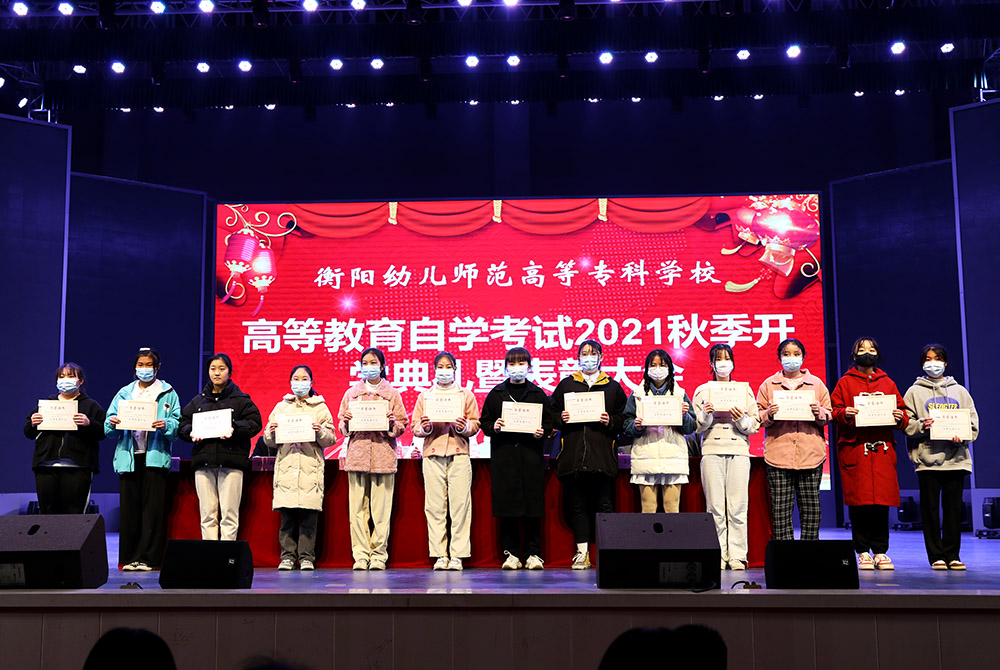 典礼在雄壮的国歌声中拉开了帷幕。首先进行表彰颁奖仪式,杨安季宣读表彰决定。授予小学教育16班等10个班“自考优秀班级”称号;授予龙术芝等26名同学“自考优秀班长”称号;授予陈慧霞等163名同学“自考先进个人”称号;授予蒋胜霞等18名老师“继续教育先进个人”称号。