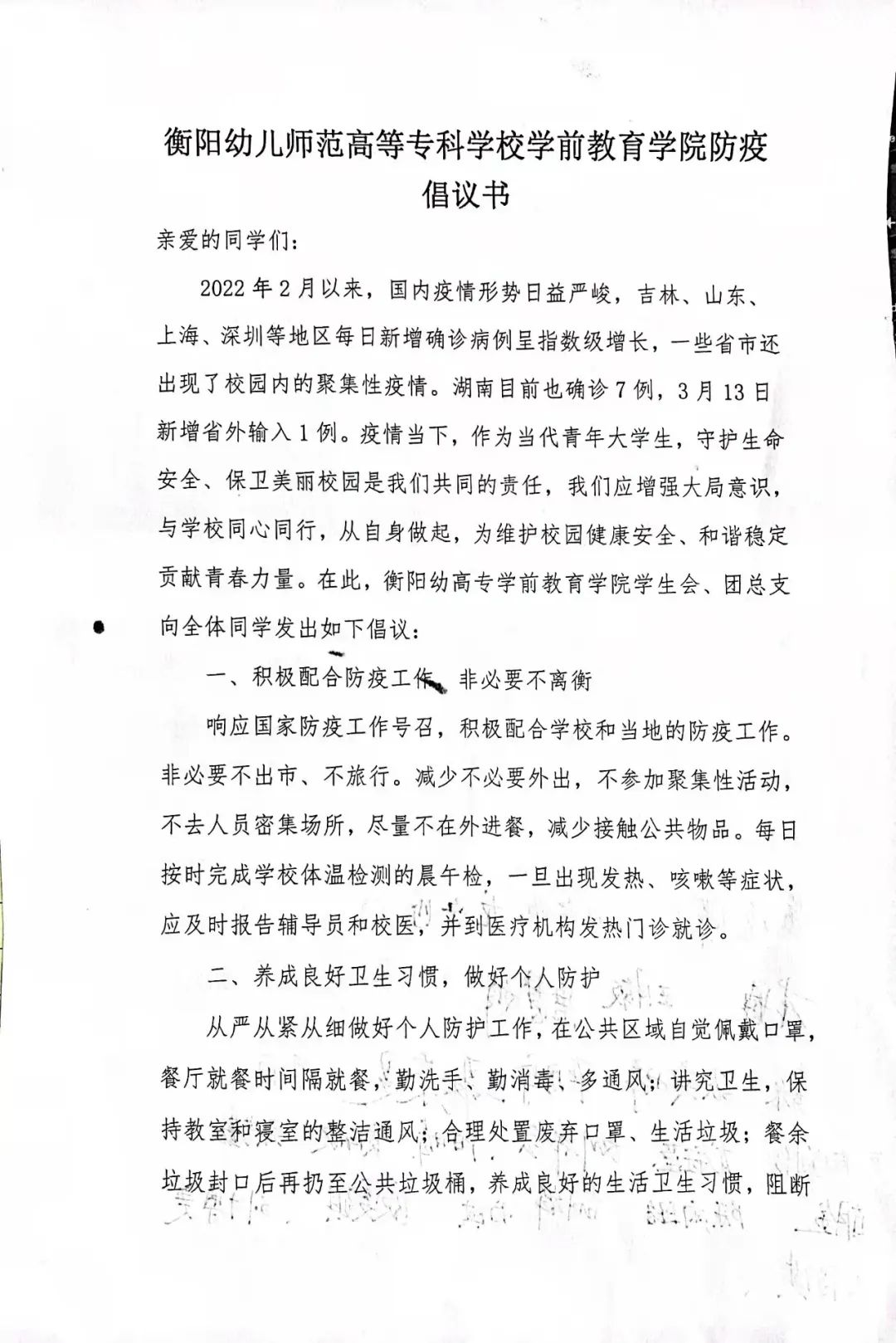 2022年2月以来,国内疫情形势日益严峻,吉林、山东、上海、深圳等地区每日新增确诊病例呈指数级增长,一些省市还出现了校园内的聚集性疫情。湖南目前也确诊7例,3月13日新增省外输入1例。疫情当下,作为当代青年大学生,守护生命安全、保卫美丽校园是我们共同的责任,我们应增强大局意识,与学校同心同行,从自身做起,为维护校园健康安全、和谐稳定贡献青春力量。在此,衡阳幼高专学前教育学院学生会、团总支向全体同学发出如下倡议: 一、积极配合防疫工作,非必要不离衡 响应国家防疫工作号召,积极配合学校和当地的防疫工作。非必要不出市、不旅行。减少不必要外出,不参加聚集性活动,不去人员密集场所,尽量不在外进餐,减少接触公共物品。每日按时完成学校体温检测的晨午检,一旦出现发热、咳嗽等症状,应及时报告辅导员和校医,并到医疗机构发热门诊就诊。 二、养成良好卫生习惯,做好个人防护 从严从紧从细做好个人防护工作,在公共区域自觉佩戴口罩,餐厅就餐时间隔就餐,勤洗手、勤消毒、多通风;讲究卫生,保持教室和寝室的整洁通风;合理处置废弃口罩、生活垃圾;餐余垃圾封口后再扔至公共垃圾桶,养成良好的生活卫生习惯,阻断病毒传播。 三、明辨信息真伪,做权威信息的传播者 全院青年学生自觉做到不造谣、不信谣、不传谣。从官方渠道及时了解疫情防控实时动态;掌握正确的疫情防控知识;用科学和理性的态度认识疫情、做好疫情防控;科学传播防护知识,引导广大群众提高安全意识,落实防护措施;增强信息辨别力,积极传递正能量,坚定抗击疫情的信心和决心。 四、强化责任担当,发挥模范作用。 关键时期我们当代青年大学生应当自觉做表率,全力配合学校疫情防控各项工作,主动作为,听从调度,积极宣传防疫要求,普及防控知识,以实际行动彰显先锋模范作用。 生命重于泰山!让我们万众一心、众志成城,为坚决遏制疫情传播扩散,夺取疫情防控斗争胜利肩负起应尽的责任,贡献出自己的力量! 编辑 | 刘姣 文稿 | 学生会 团总支 图片|团总支宣传部 责任编辑 | 陈琴 严思宇 一审 | 吴迪 终审 | 刘东航