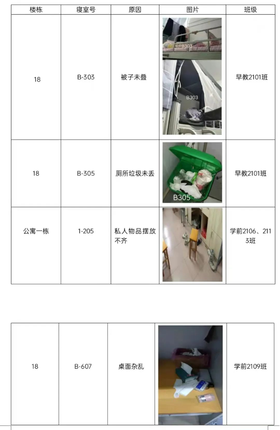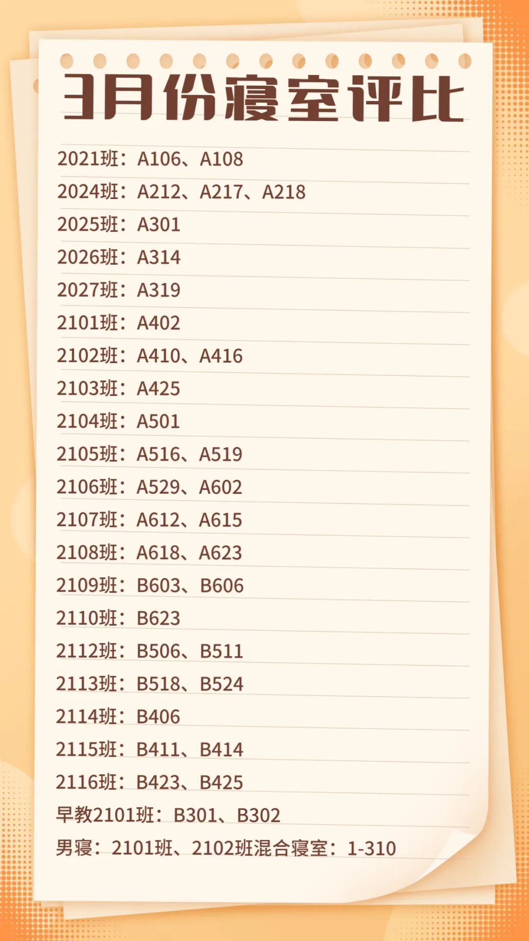 寝室作为一个最小的独立集体单位,是寝室成员的喜好与个性展示的舞台。 为了给同学们搭建一个展示自我个性,风采的舞台,增强同学们的团结协作精神,使同学们养成良好的生活、卫生习惯,培养同学们创造美、保持美的能力和习惯。我院学生会开展了第三次学前教育学院优秀文明寝室评比活动。经过3月28号老师和同学的评选,3月份优秀文明寝室评比活动现已结束。现将获奖寝室公布如下: 恭喜以上获奖的36个寝室 希望获奖寝室继续发扬 也希望其他寝室向以上寝室学习 不断吸取优点、改进不足 不断营造良好的学习和生活环境 为寝室文化建设事业锦上添花 接下来我们一起来瞧瞧文明寝室的风采吧 2116班B423 2114班B406 2116班B425 2027班A319 2101、2102混寝1-310 2102班A410 2105班A516 2021班A106 三月,万象更新,春暖花开,姹紫嫣红。可是在倒春寒的捣乱下,同学们的衣服更换一日四季,导致本来就不大的宿舍更加拥挤,混乱不堪。疫情强势来袭,保持宿舍卫生干净整洁,室内空气流通,减少细菌滋生迫在眉睫。为了同学们的身心健康,督促同学们养成良好的个人卫生习惯,学前教育学院宿管部对所有寝室进行检查,发现有一些宿舍还需要整改。希望同学们共同维护、保护、爱护自己温馨的“家”。 需要整改的寝室 此次活动,既培养了同学们定期清洁寝室卫生的意识,又增强了寝室的凝聚力,营造出温馨洁净的寝室氛围,同时全力配合做好学校的防疫工作,宿管部会不懈地坚持和奋斗,争取在未来把工作做得更好,为学生们的健康、安全保驾护航。