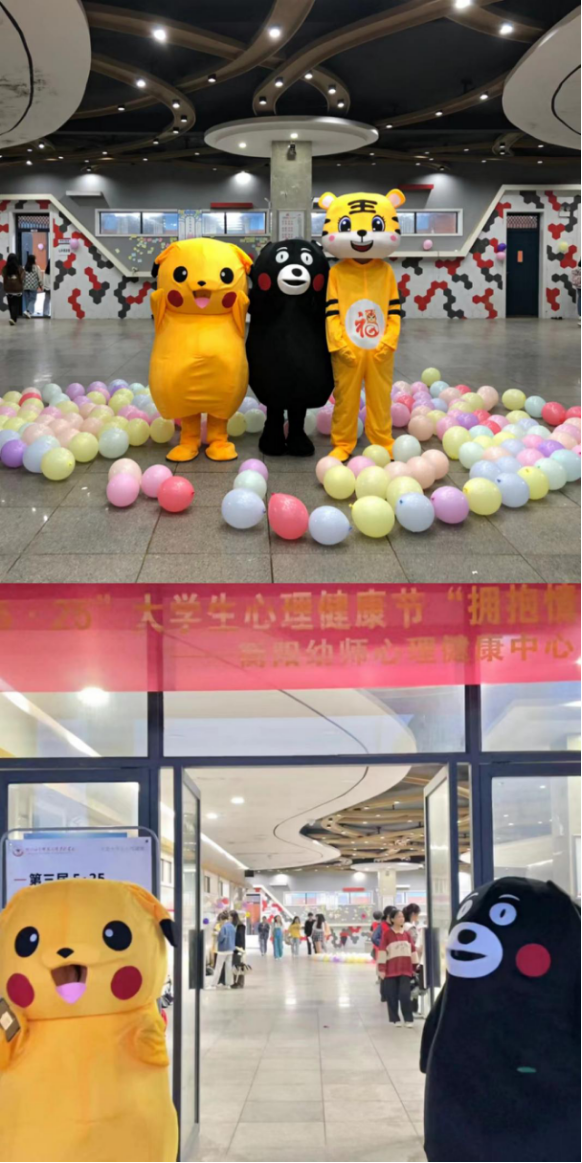 来到我们的游戏区,进门就可以看见我们可爱的皮卡丘和熊本熊在等待着给大家爱的抱抱。老师们也迫不及待地跟玩偶拥抱、合影。