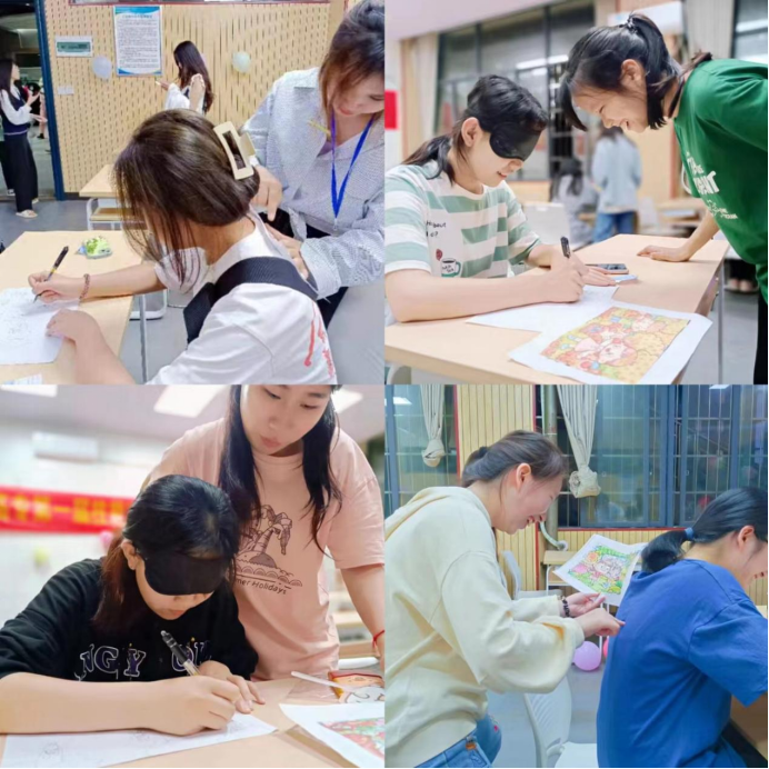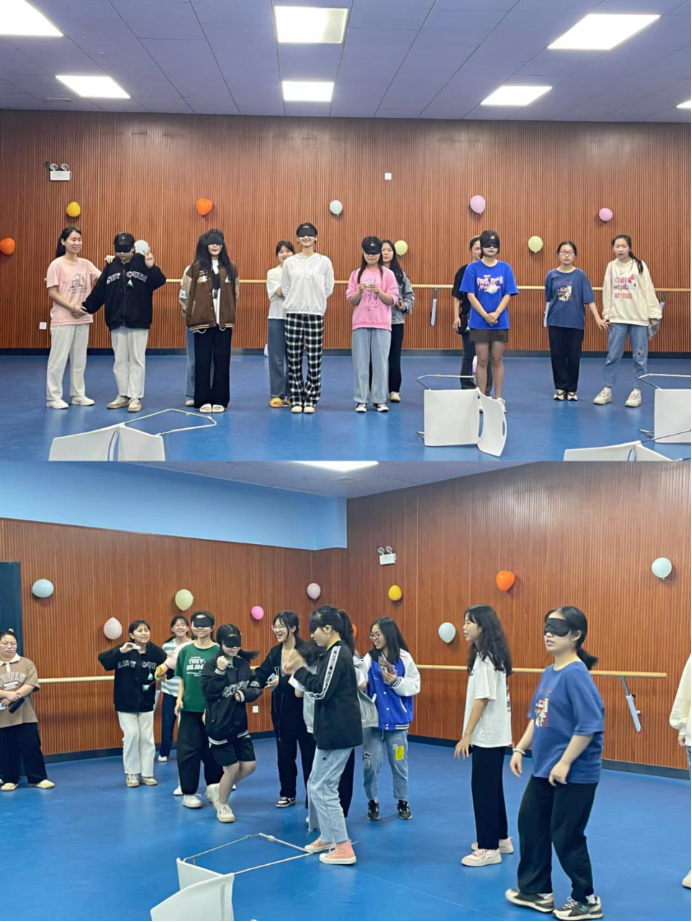 “南辕北辙”活动主要是通过伙伴的沟通引导,戴上眼罩避开障碍物,开心的到达终点。