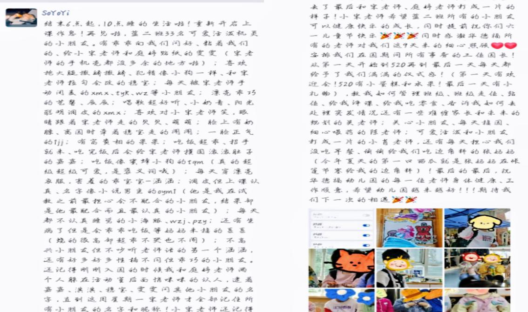 感受到爱的同时收获也很多,不光对幼儿园一日生活工作有了更清晰的认知,对于幼儿园教育和保育工作也有了整体认知,甚至还能比较好的组织一个小小的活动。