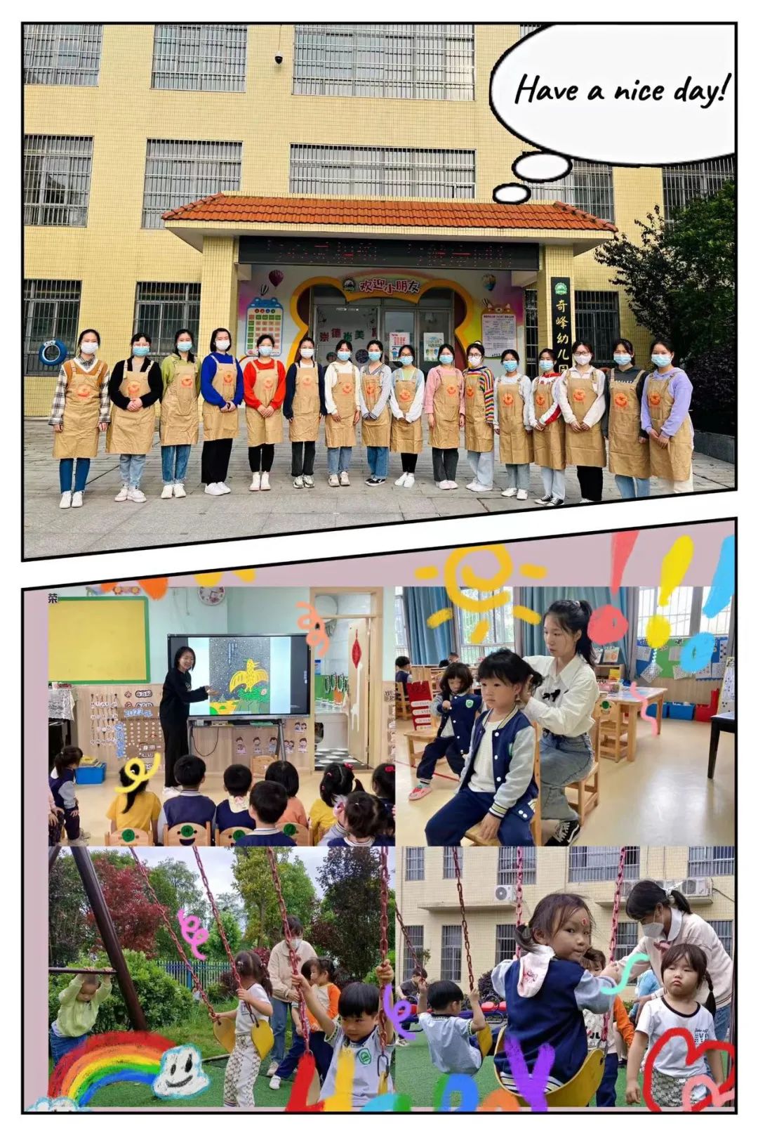 奇峰分享篇:奇峰幼儿园外部环境优美,山清水秀,内部环创包含了园所足球特色。老师和小朋友们都非常热情,是一所充满爱的幼儿园。幼儿园为我们专门准备了公开课供我们学习,同时幼儿园的老师也给了我们许多专业的指导,让我们受益匪浅。各班的老师,保育员老师也很有耐心和责任感,他们身上所具有的良好品质是我们应该虚心学习的。我深知光是学书上的理论知识是远远不够的,“实践才是检验真理的唯一标准”。