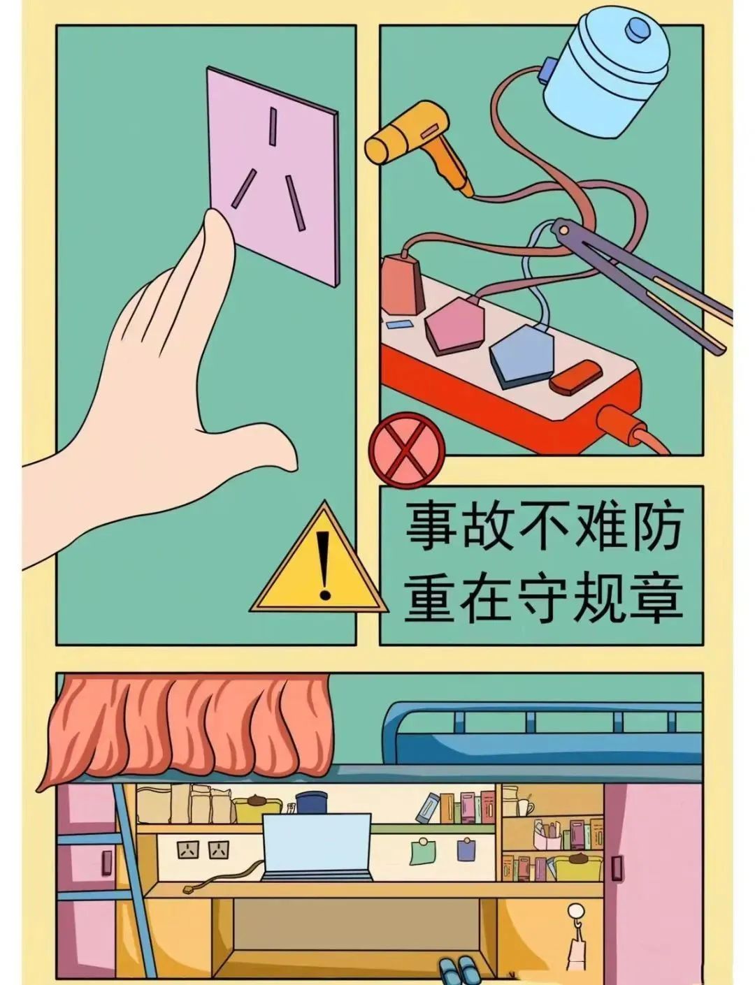 宿舍安全:学生宿舍内不违规使用热得快、卷发棒等大功率电器,不使用明火,注意用电安全。遵守学生宿舍管理规定,不留宿外人,按时归寝。