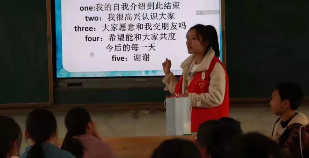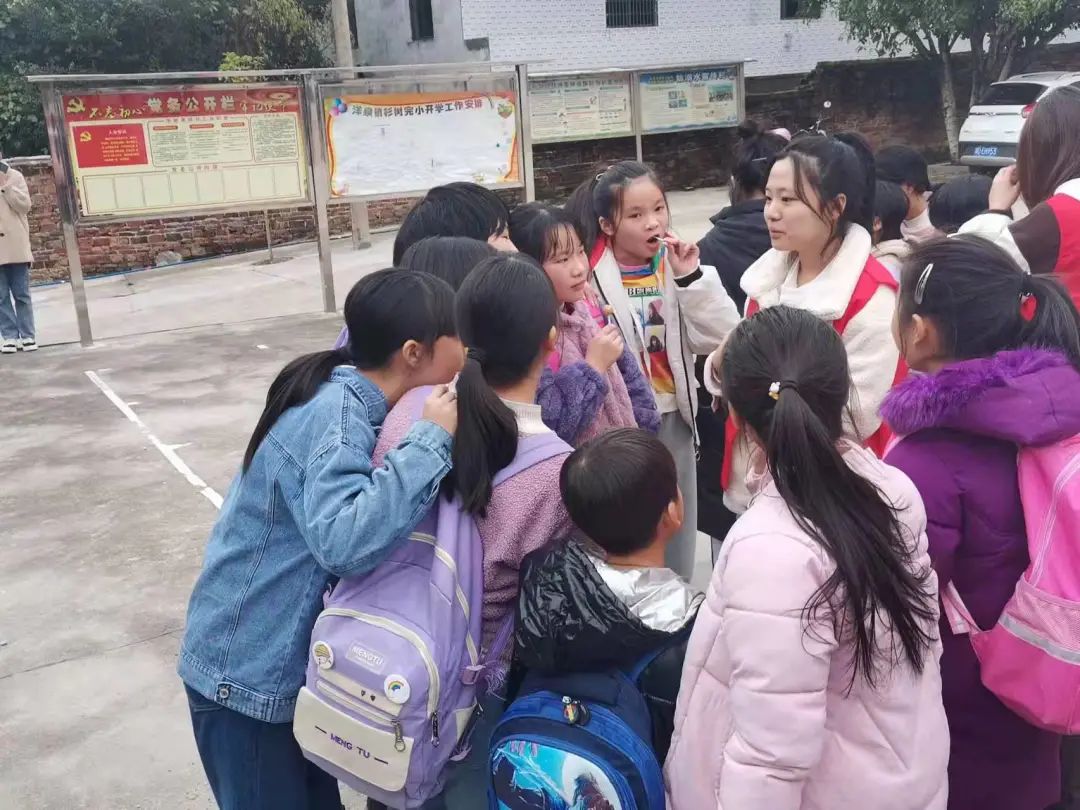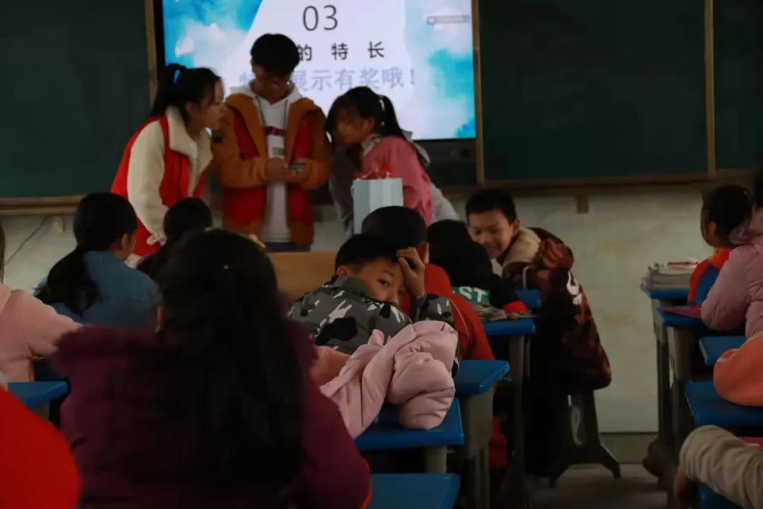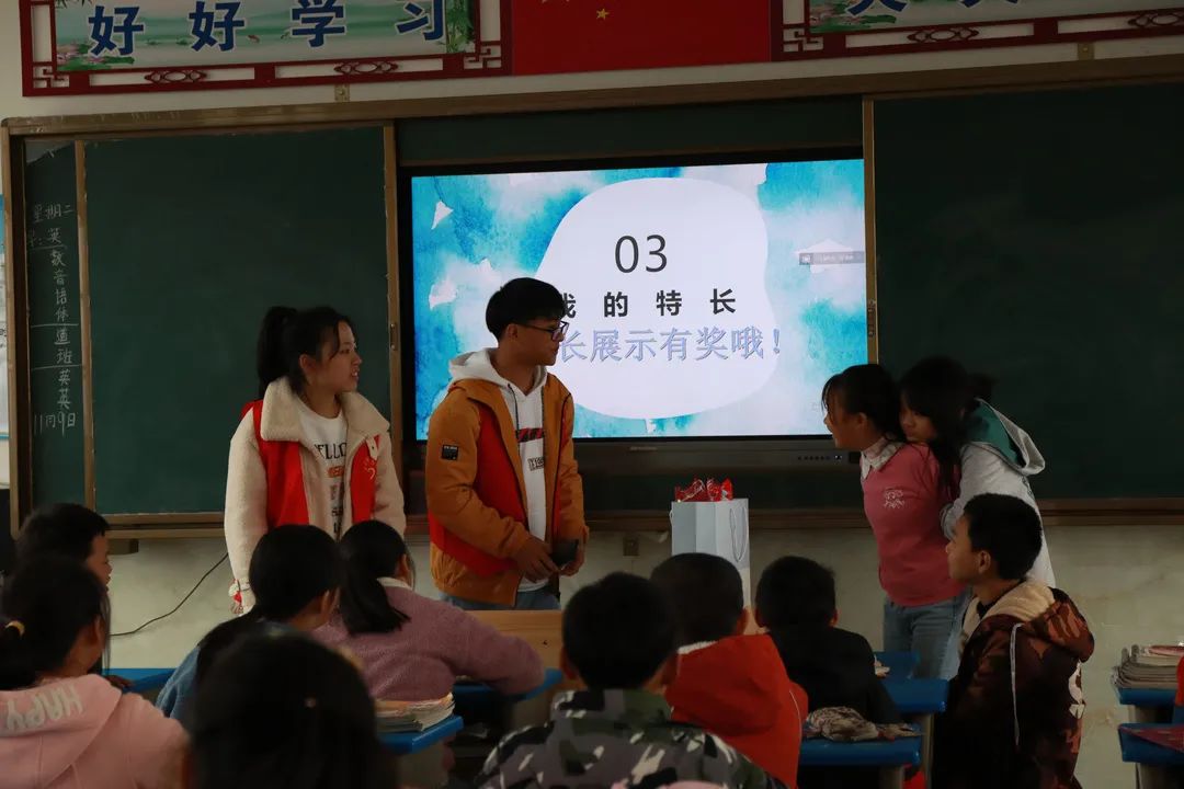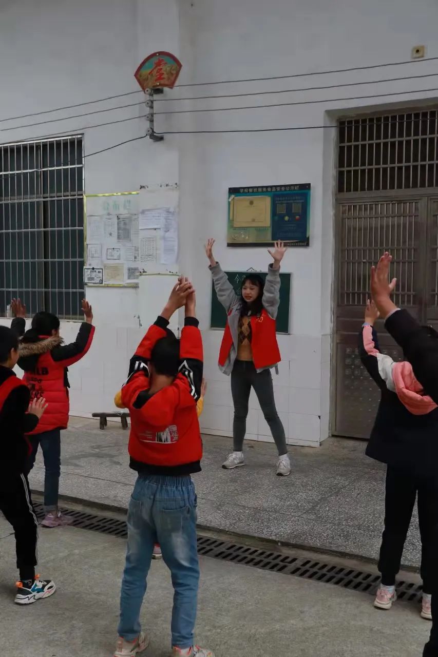 同学们积极配合志愿老师们,挥舞着他们的小手,踩着音乐的节拍,跳着属于他们的天真无邪。 杉树完小的老师们也跟着一起舞动,她们将来会是杉树完小的艺术专干,希望她们今后能自己开展多彩的艺术活动! 《花式跳绳》 由丁妍小团队带领的花式跳绳,吸引了所有老师领导和小朋友的目光,孩子们跳着属于他们的花样年华,笑声在操场上荡漾。此时此刻,他们比骄阳还要耀眼,恣意燃烧着他们的激情,犹如大旱后的甘霖浇开了心灵之花。 《趣味武术》 张诤诤老师的小团队有声有色,把小朋友带到了一个新的世界,武功谁最强,舍我其谁。学习武术的目的,不仅仅是为了强身健体,更是潜移默化的传承。希望他们能在武术的学习中领会到中华优秀传统文化的魅力。 《小小主持人》 志愿老师们用小游戏拉近了彼此的距离,化解了因为害羞而产生的尴尬,让孩子们能够在讲台上肆意展现自我,将自己隐藏的光芒尽情展露,被蒙尘的钻石怎么甘心一直黯淡呢? 蒋水平老师发现,幼高专志愿者队造成了家长的围观,他们的心里产生了一次强烈的震动!以前不愿意参加课后活动的学生也强烈要求参加了。“市里大学来乡村小学啦”,相信这句话不久就会成为美谈在民间流传。 姚赛红老师也发出感慨:“今天的支教,给乡村孩子们带去了丰富的艺术活动体验,更是让我们小教、数理院同去的助教大学生们得到了迅速的成长。在带队老师的指导下,小教、数理院的学生们也得到了校方的高度赞扬。我们不但送去了小教学院、数理学院的专业教师力量,也收获了小学师生的情谊”。 周晶晶同学表示:“昨天经历一个很特别的下午,很荣幸来到杉树完小带领同学们上了一堂很有趣的播音课 。刚开始特别紧张,怕自己不能把所学的播音知识很好的教给她们,可当我看到一张张可爱的面孔,她们瞪大圆圆的眼睛可爱的看着我,我顿时变得轻松了,小朋友们全程很配合我,让我觉得原来我可以做好小老师。傍晚要准备回校时,她们拉着我的手,强烈要求我去她们家住,我心中便油然而生不舍之情,非常期待与她们的再次相见”。 课后交流 课后服务后,我们随机找了两位可爱的小同学进行采访,让我们来看看她们对这次活动的看法吧! 我们还采访了完小的校长,听听他怎么看待我们这次的活动呢? 挥手告别 在最后将要离开的时候,孩子们围在大巴周围依依不舍的挥着手,一声声说着再见,离别的惆怅笼罩在大巴里。但是我们都知道,世上没有不散的宴席,大家只能在心里殷殷期待着下次的再见。 这次活动让我们看到了同学们对新鲜事物的热情,这份热情就像冬日里的暖阳,源源不断的散发着他们的光和热,也让靠近的人被这份温暖深深打动着。同时,对于活动中那些即将成为人民教师的志愿者们也是一次深刻地感悟吧,或许成长就在这一刻悄然发芽了呢。